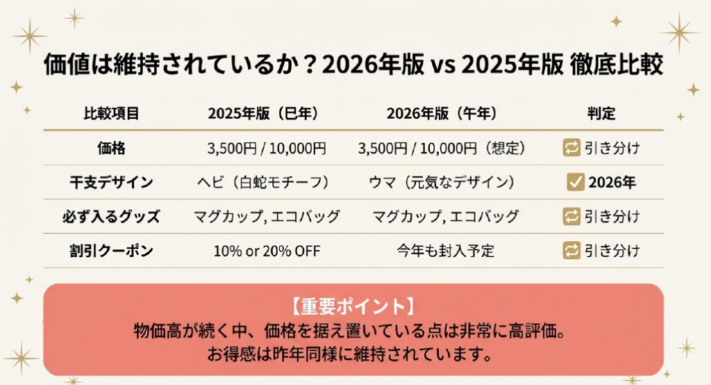 そこで、私が購入した昨年の「2025年版(巳年)」と、発表されている「2026年版(午年)」の情報を比較してみました。