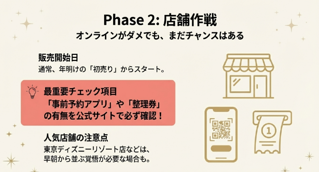 - 人気の店舗(東京ディズニーリゾート店など)は、早朝から並ぶ必要があるかもしれません。