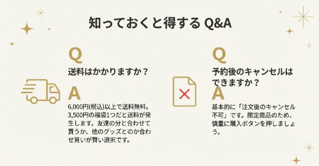 3,500円の福袋だけだと送料がかかる場合があるので、友達の分と合わせて2つ買うか、他のグッズと合わせ買いするのが賢いテクニックです!