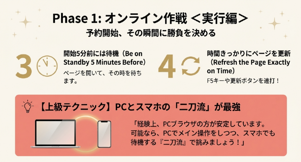 - 予約開始日はPCとスマホの二刀流で待機!