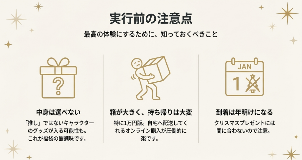 - 箱が大きくて場所を取る 特に1万円の福袋は結構なサイズです。店舗で買って持ち帰るのは大変なので、オンラインで買って自宅配送にするのが圧倒的に楽です。